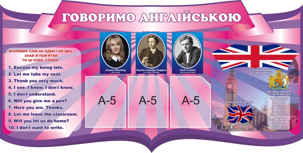 Стенд “Говоримо англійською” (Код: 3-0902) Характеристики Розмір: 1250×630 мм. Матеріал: пластик товщиною 3 мм. Вартість: 1329 грн. 1209 грн. -10% Швидке замовлення Короткий опис стенда(ів) Стенд "Говоримо англійською" призначений для заохочення учнів до вивчення англійської мови. Елементи стенду: Поради щодо ввічливих фраз: список виразів для ввічливого спілкування англійською мовою. Відомі письменники: зображення відомих англомовних авторів, таких як Джоан Роулінг, Чарльз Латвідж Доджсон та Джек Лондон. Національні символи Великобританії: прапор та герб Великобританії, а також тексти національного гімну. Стенд допомагає дітям запам’ятовувати ключові вирази для щоденного спілкування та знайомитись з англомовною культурою. Додаткова інформація Термін виготовлення: 3-5 робочих днів. Можливість ламінування: Немає. 🖨️ Друкувати Зачекайте, будь ласка ⚖️
