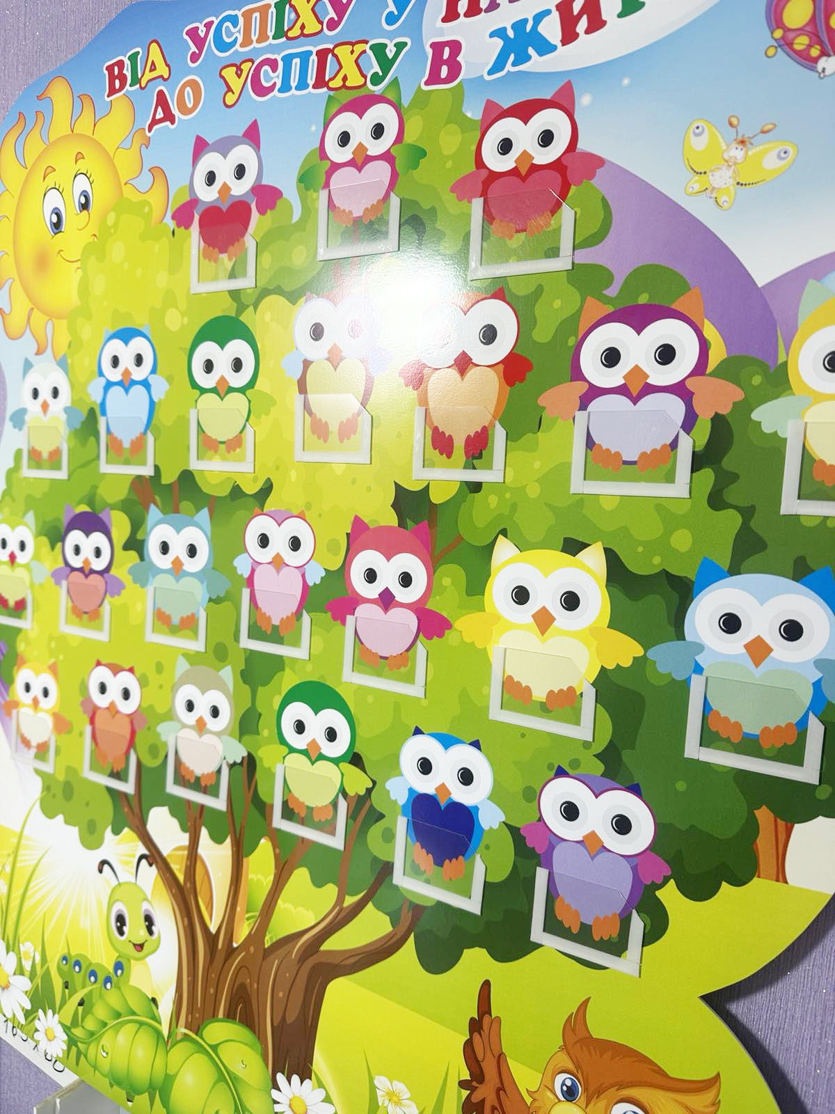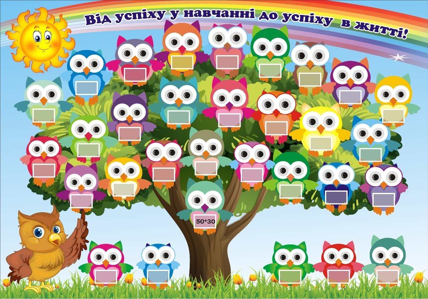 Стенд “Від успіху у навчанні до успіху в житті!” (Код: 3-1729) Характеристики Розмір: 1000×700 мм. Матеріал: пластик товщиною 3 мм. Вартість: 1249 грн. Швидке замовлення Короткий опис стенда(ів) Стенд під назвою "Від успіху у навчанні до успіху в житті" призначений для мотивації учнів. На ньому зображено дерево із совами, кожна з яких має порожню табличку для запису досягнень або результатів учнів. Барвистий дизайн із веселковим фоном і усміхненим сонцем надає позитивного настрою. Освітня ціль: заохочення старанного навчання. Візуальна привабливість: барвисті сови і веселкова дуга. Мотивація: вказує напрямок від навчання до успіху в житті. Це ідеальний інструмент для вчителів, щоб відзначати успіхи учнів. Додаткова інформація Термін виготовлення: 3-5 робочих днів. Можливість ламінування: Немає. 🖨️ Друкувати Зачекайте, будь ласка ⚖️