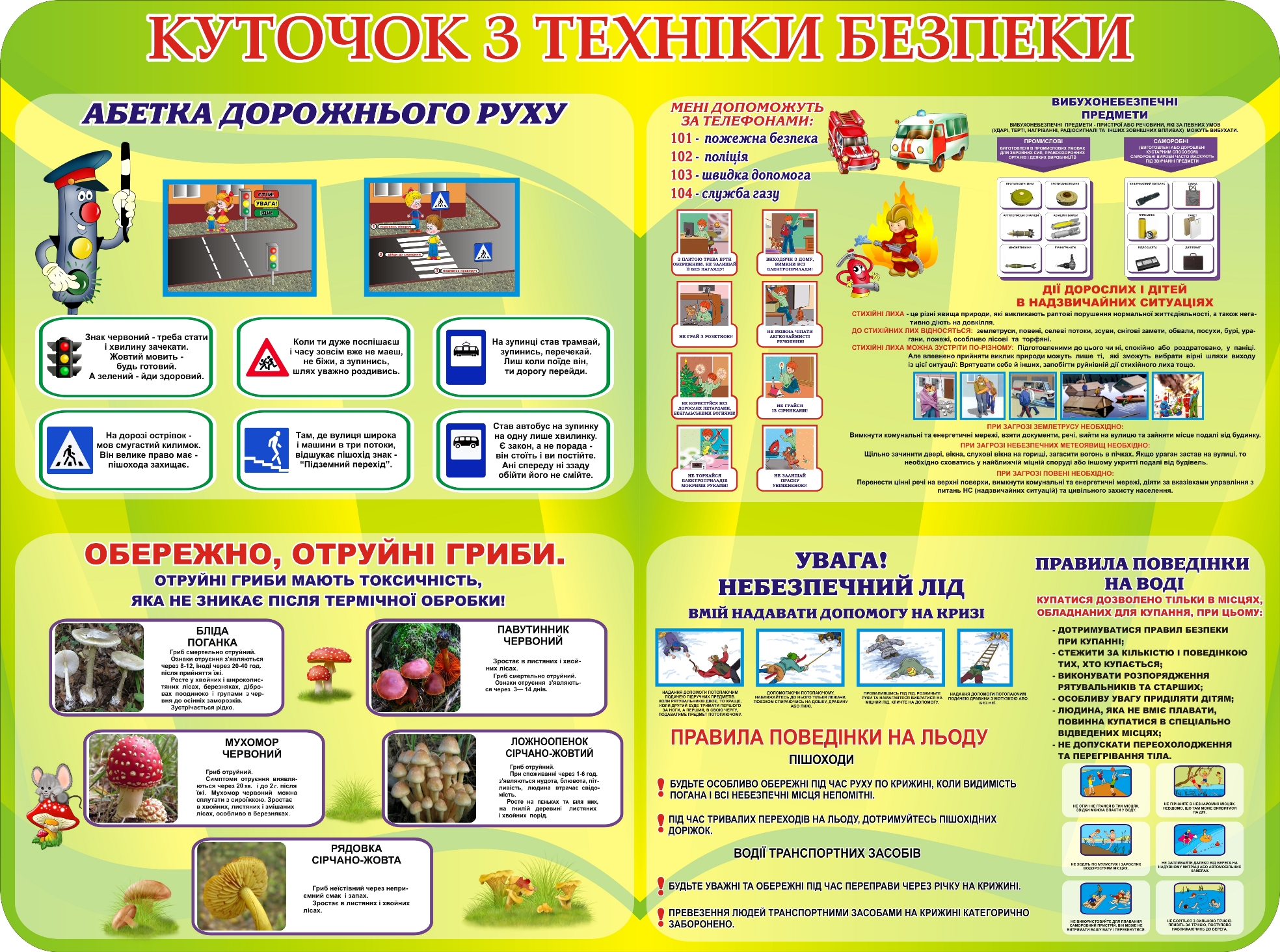 Дорослій людині необхідно знати на зубок техніку дій у надзвичайних ситуаціях. Але ще більш важливим є навчити дитину алгоритму поведінки в небезпечних ситуаціях. Цю задачу в якійсь мірі виконує куточок безпеки в школі. Він допоможе дитині поміркувати над тим, як би він вчинив у тій чи іншій ситуації. Використані сюжетні малюнки залучать більше уваги у школярів. В куточку використана віршована форма подачі матеріалу, а отже діти краще запам’ятають інформацію у римі і зможуть легко її згадати.