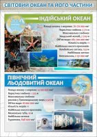 Стенд “Світовий океан та його частини” (Код: 7-ГЕО-026-9) Характеристики Розмір: 450×900 мм. Матеріал: пластик товщиною 3 мм. Вартість: 532 грн. Швидке замовлення Короткий опис стенда(ів) Стенд "Світовий океан та його частини" містить інформацію про два основних океани: Тихий та Атлантичний. Тихий океан: Площа з морями: 178 700 000 км² Пересічна глибина: 3 960 м Максимальна глибина: Маріанський жолоб, 11 022 м Об’єм води: 710 400 000 км³ Кількість морів: 25 Найбільша висота припливів: Пенжинська губа, 13,2 м Найбільша затока: Аляска, 384 000 км² Атлантичний океан: Площа з морями: 91 700 000 км² Пересічна глибина: 3 926 м Максимальна глибина: жолоб Пуерто-Ріко, 8 742 м Об’єм води: 330 000 000 км³ Кількість морів: 16 Найбільша висота припливів: затока Фанді, 18 м Найбільша затока: Мексиканська, 1 555 000 км² Додаткова інформація Термін виготовлення: 5-10 робочих днів. Можливість ламінування: Немає. 🖨️ Друкувати Зачекайте, будь ласка ⚖️