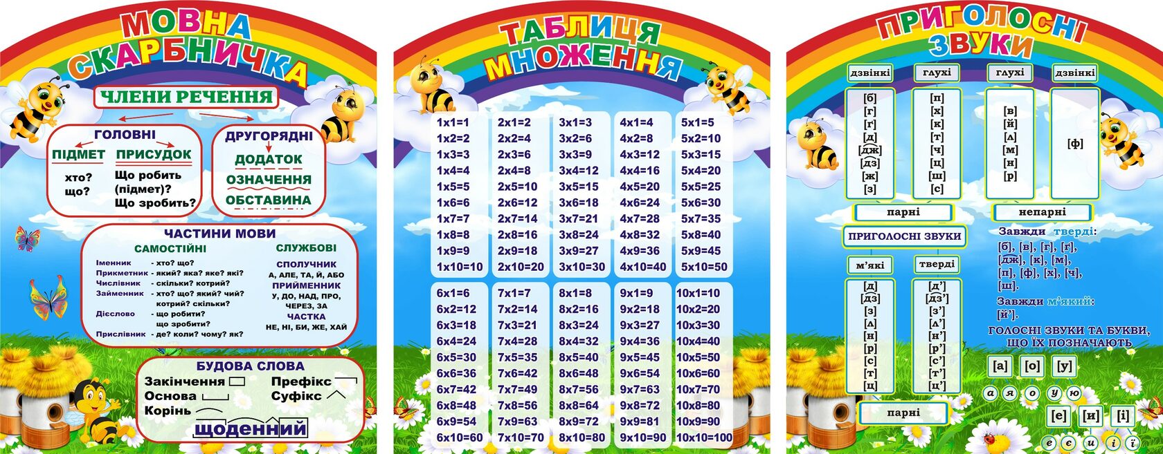 Набір стендів для початкової школи Характеристики Розмір: 480×580мм.×3шт. Матеріал: пластик товщиною 3 мм. Вартість: 1213 грн. Швидке замовленняКожен елемент комплекту можна придбати окремо. Короткий опис стенда(ів) Стенди складаються з трьох частин, кожна з яких присвячена окремій темі. Мовна скарбничка: розглядає склад речення, головні та другорядні члени речення, частини мови (самостійні: іменник, прикметник тощо, службові: сполучники, прийменники та частки), та будову слова (корінь, суфікс, префікс, закінчення). Таблиця множення: представлена у вигляді таблиці для легкого вивчення основних математичних фактів до 10. Приголосні звуки: поділ на дзвінкі та глухі, парні та непарні приголосні звуки, а також тверді та м'які приголосні. Голосні звуки теж представлені на стенді. Додаткова інформація Термін виготовлення: 3-5 робочих днів. Можливість ламінування: Немає. 🖨️ Друкувати Зачекайте, будь ласка ⚖️