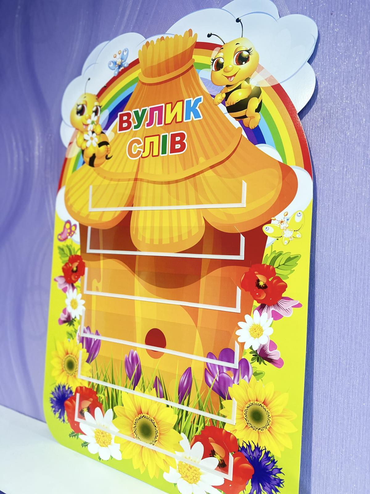 Стенд для НУШ “Вулик слів” (Артикул: 3-0083) Характеристики Розмір: 500мм.х780мм. Матеріал: пластик товщиною 3 мм. Вартість: 653 грн. Швидке замовлення Короткий опис стенда(ів) Стенд "Вулик слів" призначений для навчання і розвитку мовлення дітей. Основне його завдання — допомогти вивчати нові слова у формі гри. Яскравий дизайн з бджілками та квітами робить його привабливим для дітей. Стенд може мати кілька секцій для слів, які можна змінювати залежно від теми уроку. Викладачі можуть заповнювати ці секції новими словами, організовуючи їх у зрозумілий та цікавий спосіб. Цей інструмент сприяє покращенню лексичного запасу учнів, стимулюючи одночасно візуальне та асоціативне мислення. Додаткова інформація Термін виготовлення: 3-5 робочих днів. Можливість ламінування: Немає. 🖨️ Друкувати Зачекайте, будь ласка ⚖️