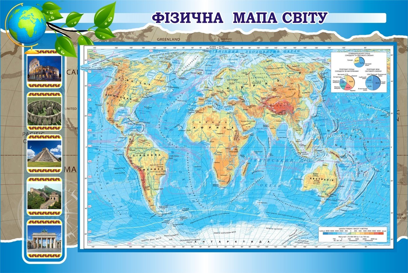 Стенд «Фізична мапа світу» (Артикул: 3-1456) Характеристики Розмір: 1150мм.×770мм. Матеріал: пластик товщиною 3 мм. Вартість: 1169 грн. Швидке замовлення Короткий опис стенда(ів) Стенд демонструє фізичну карту світу, яка містить зображення континентів, океанів, гірських масивів і річок. На карті відображено різноманіття рельєфу та водних об'єктів на земній кулі. Легенда пояснює градації висот і глибин, що дозволяє краще орієнтуватися в географічному розташуванні та абсолютних висотах. З лівого боку стенду розміщені ілюстрації відомих туристичних об'єктів і пам'яток світу. Вони служать як візуальні покажчики до основних культурних і історичних місць на планеті. Додаткова інформація Термін виготовлення: 3-5 робочих днів. Можливість ламінування: Немає. 🖨️ Друкувати Зачекайте, будь ласка ⚖️