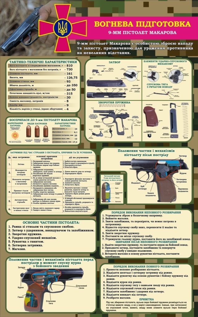 Стенд «Вогнева підготовка» (Артикул: 3-1629) Характеристики Розмір: 600мм.×960мм. Матеріал: пластик товщиною 3 мм. Вартість: 761 грн. Швидке замовлення Короткий опис стенда(ів) Стенд присвячений вогневій підготовці з використанням 9-мм пістолета Макарова. Він містить детальну інформацію про тактико-технічні характеристики пістолета, такі як вага, довжина прицільної лінії, початкова швидкість кулі та ефективна дальність стрільби. Основні розділи стенду: Технічні характеристики та основні частини пістолета. Типи та характеристики набоїв. Механізми пістолета, затвор та зворотня пружина. Порядок виконання неповного та повного розбирання. Затримки під час стрільби, їх причини та усунення. Стенд також демонструє положення частин та механізмів пістолета перед пострілом. Додаткова інформація Термін виготовлення: 3-5 робочих днів. Можливість ламінування: Немає. 🖨️ Друкувати Зачекайте, будь ласка ⚖️