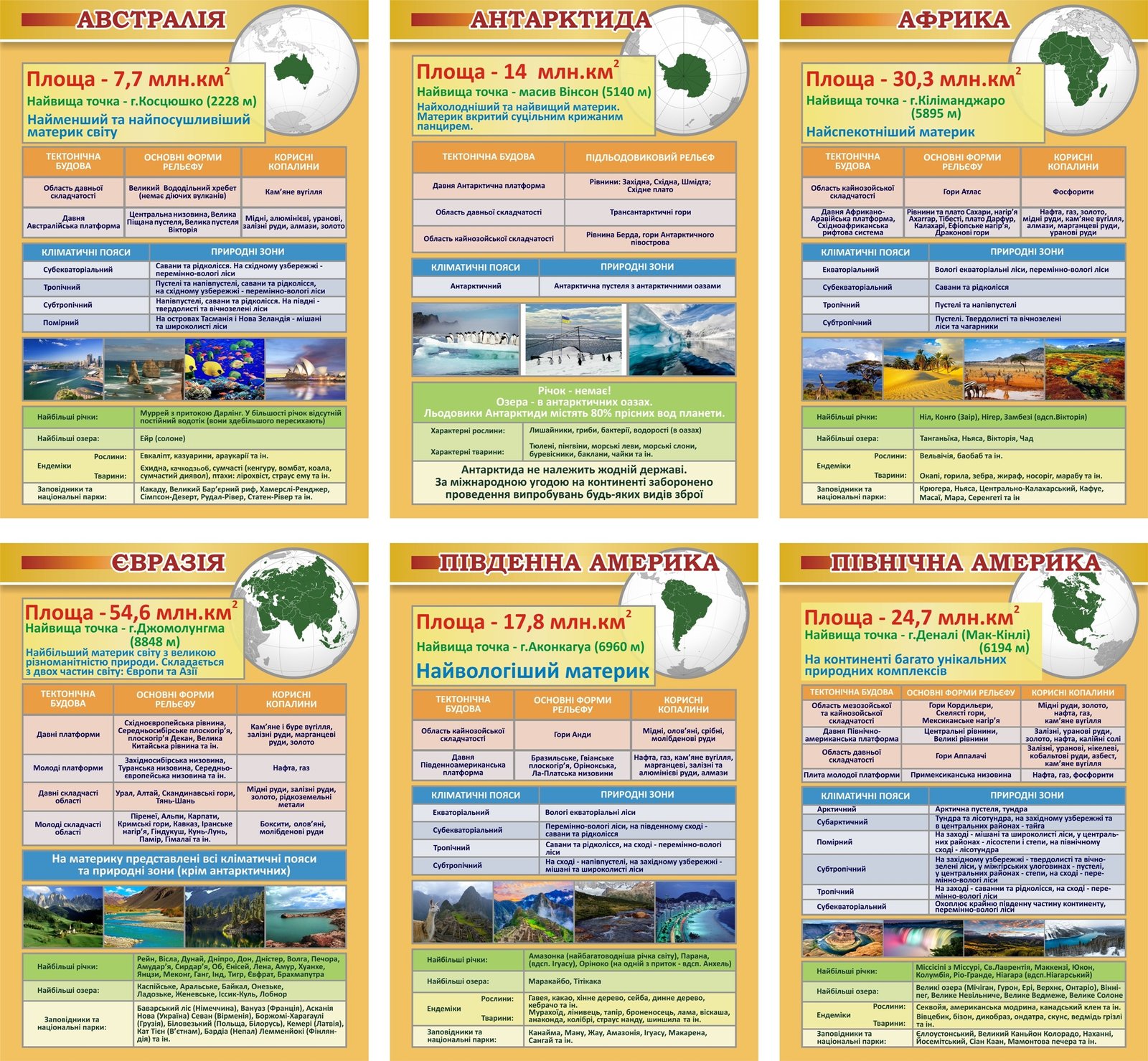Набір стендів для кабінету географії «Материки» (Артикул: 3-1746) Характеристики Розмір: 640мм.×900мм.×6шт. Матеріал: пластик товщиною 3 мм. Вартість: 4562 грн. Швидке замовленняКожен елемент комплекту можна придбати окремо. Короткий опис стенда(ів) Стенди представляють інформацію про континенти: Австралія: Площа - 7,7 млн.км², найвища точка - г. Косцюшко. Вказано кліматичні пояси та природні зони. Антарктида: Площа - 14 млн.км², найвища точка - масив Вінсон. Описано льодовиковий рельєф. Африка: Площа - 30,3 млн.км², найвища точка - Кіліманджаро. Особливість - найспекотніший материк. Євразія: Площа - 54,6 млн.км², найвища точка - г. Джомолунгма. Показано різноманіття кліматів і природних зон. Південна Америка: Площа - 17,8 млн.км², найвища точка - Аконкагуа. Вказано різноманітність екосистем. Північна Америка: Площа - 24,7 млн.км², найвища точка - г. Деналі. Представлено природні комплекси. Стенди містять корисну інформацію про географію, клімат, рельєф та корисні копалини кожного континенту. Додаткова інформація Термін виготовлення: 3-5 робочих днів. Можливість ламінування: Немає. 🖨️ Друкувати Зачекайте, будь ласка ⚖️