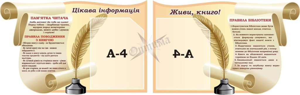 Набір стендів для бібліотеки (Артикул: 3-1816) Характеристики Розмір: 620мм.×400мм.×2шт. Матеріал: пластик товщиною 3 мм. Вартість: 779 грн. Швидке замовленняКожен елемент комплекту можна придбати окремо. Короткий опис стенда(ів) Стенд містить важливу інформацію для читачів та відвідувачів бібліотеки. Ліва частина стенду має заголовок "Цікава інформація" і включає пам'ятку читача та правила поводження з книгою: Оберігати книгу в папір. Не читати книгу під час їжі. Не класти в книгу об'ємні предмети. Не загинати ріжки. Не робити позначок у книзі. Права частина під заголовком "Живи, книго!" містить правила бібліотеки: Користувачем може бути кожен учень, вчитель, батько. Необхідна реєстрація. Підручники повертаються наприкінці року. Книги видаються на 30 днів. Енциклопедії — тільки в читальному залі. Втрачена книга має бути компенсована. Додаткова інформація Термін виготовлення: 3-5 робочих днів. Можливість ламінування: Немає. 🖨️ Друкувати Зачекайте, будь ласка ⚖️