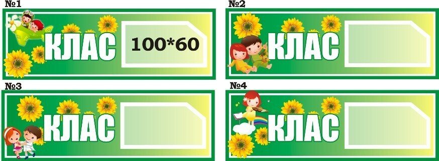 Таблички на шкільні кабінети в асортименті (Артикул: 3-1940) Характеристики Розмір: 300мм.×100мм. Матеріал: пластик товщиною 3 мм. Вартість: 53 грн. / одна Швидке замовлення Короткий опис стенда(ів) Комплект табличок призначений для позначення класних кабінетів. Всі таблички мають зелений фон із зображеннями дітей та соняхів, що додає їм яскравості та привітності. Центральний елемент — слово «КЛАС» великими літерами, поруч з яким є місце для номера чи іншої інформації. Табличка №1: має позначку 100*60 замість вільного місця, ілюстрована дітьми та квітами. Табличка №2: включає зображення дітей поруч зі словом «КЛАС» та вільне місце для номера. Табличка №3: схожий дизайн з дітьми та квітами і простором для номера. Табличка №4: містить ілюстрацію дівчинки на веселці та простір для власного напису. Ці таблички створюють теплу та привітну атмосферу в школі. Додаткова інформація Термін виготовлення: 3-5 робочих днів. Можливість ламінування: Немає. 🖨️ Друкувати Зачекайте, будь ласка ⚖️