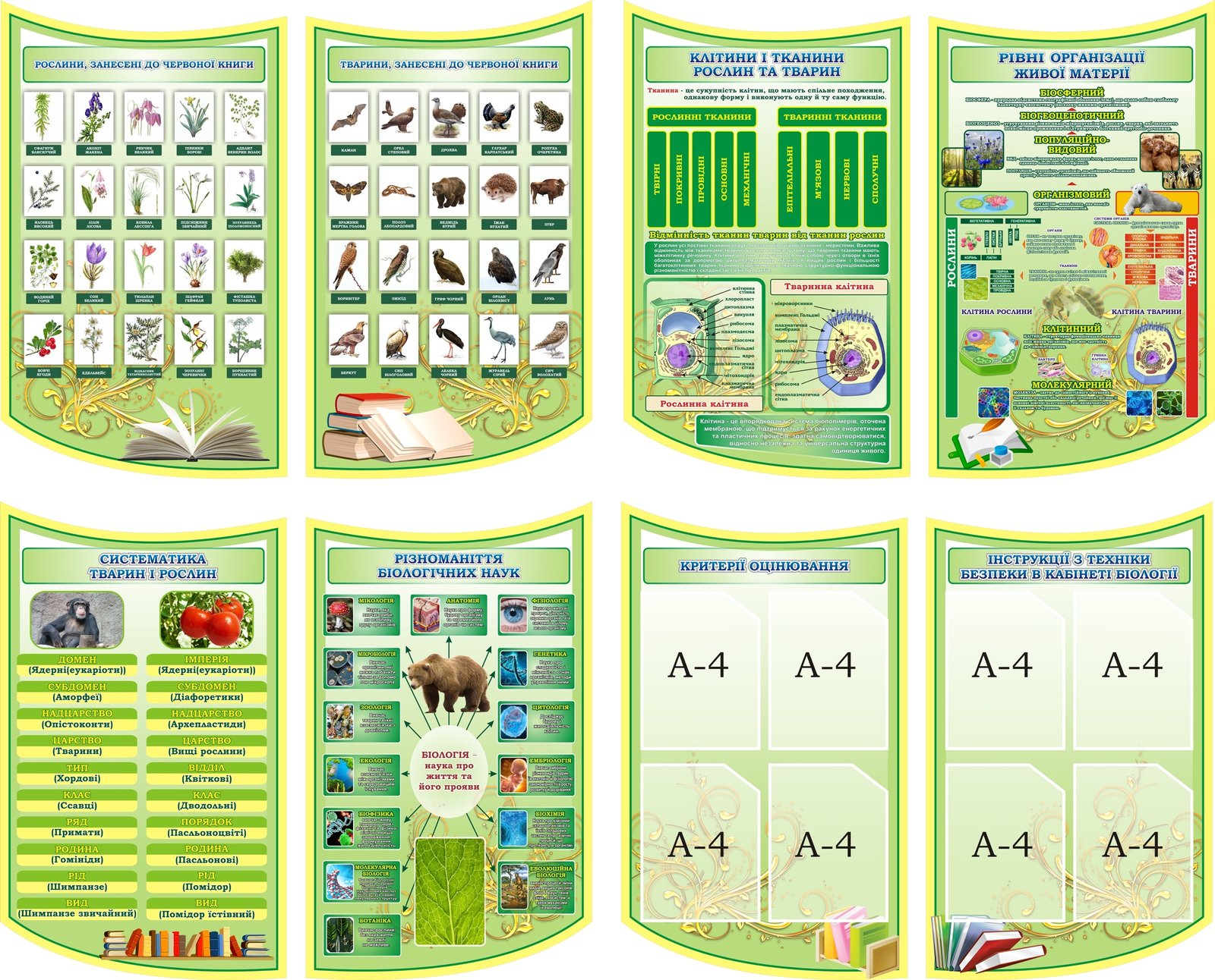 Набір стендів для кабінету біології (Артикул: 3-2267) Характеристики Розмір: 550мм.х920мм.х8шт. Матеріал: пластик товщиною 3 мм. Вартість: 6666 грн. 5555 грн. -20% Швидке замовленняКожен елемент комплекту можна придбати окремо. Короткий опис стенда(ів) Стенди призначені для навчальних кабінетів біології та охоплюють такі теми: «Рослини та тварини, занесені до Червоної книги» демонструють зображення та назви рідкісних видів флори і фауни. «Клітини і тканини рослин та тварин» зображують структуру клітин і типи тканин. «Рівні організації живої матерії» описують біологічну організацію від молекул до біосфери. «Систематика тварин і рослин» детальніше пояснює класифікацію видів. «Різноманіття біологічних наук» представляє різні сфери та їх вплив на вивчення життя. Також є місця для критеріїв оцінювання та інструкцій з безпеки. Додаткова інформація Термін виготовлення: 3-5 робочих днів. Можливість ламінування: Немає. 🖨️ Друкувати Зачекайте, будь ласка ⚖️