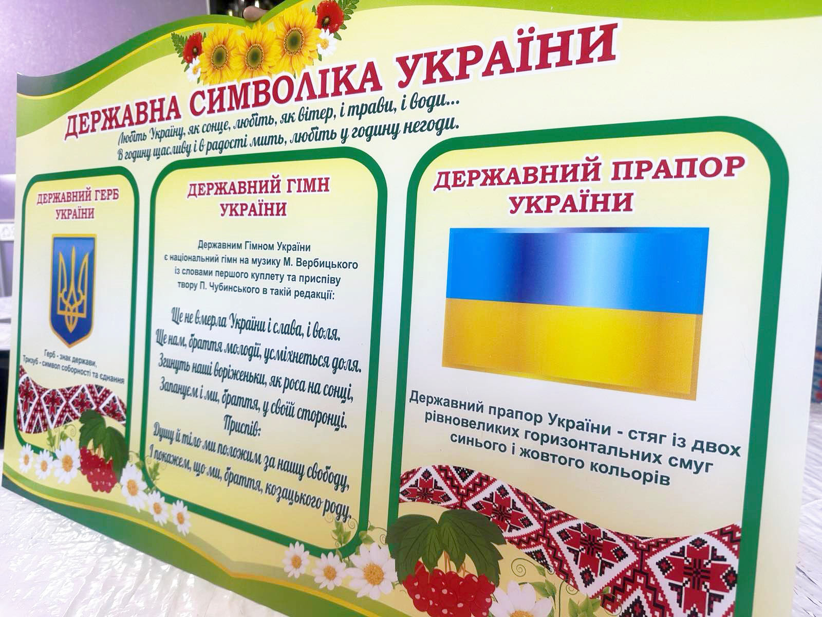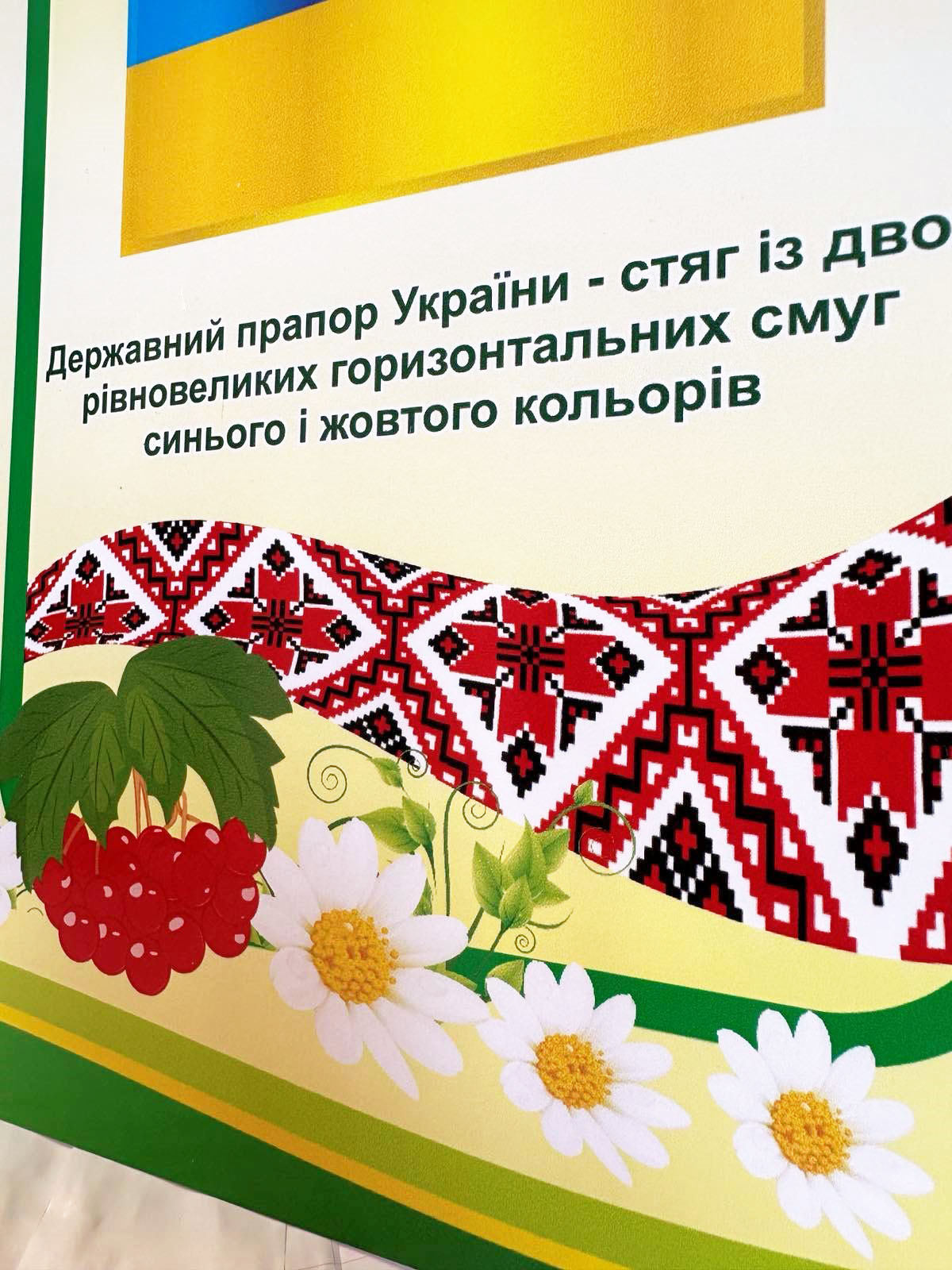Стенд «Державна символіка України» (Артикул: 3-2271) Характеристики Розмір: 800мм.×500мм. Матеріал: пластик товщиною 3 мм. Вартість: 580 грн. 528 грн. -10% Швидке замовлення Короткий опис стенда(ів) Стенд представляє державну символіку України, включаючи герб, гімн та прапор. Державний Герб України: Тризуб - символ соборності та єднання, офіційний знак держави. Державний Гімн України: Представлено текст першого куплету та приспіву гімну, написаного М. Вербицьким на слова П. Чубинського. Державний Прапор України: Синьо-жовтий стяг складається з двох рівновеликих горизонтальних смуг. Стенд містить також декор з національними українськими елементами, такими як вишивка та квіти, що підкреслюють національну гордість та ідентичність. Додаткова інформація Термін виготовлення: 3-5 робочих днів. Можливість ламінування: Немає. 🖨️ Друкувати Зачекайте, будь ласка ⚖️
