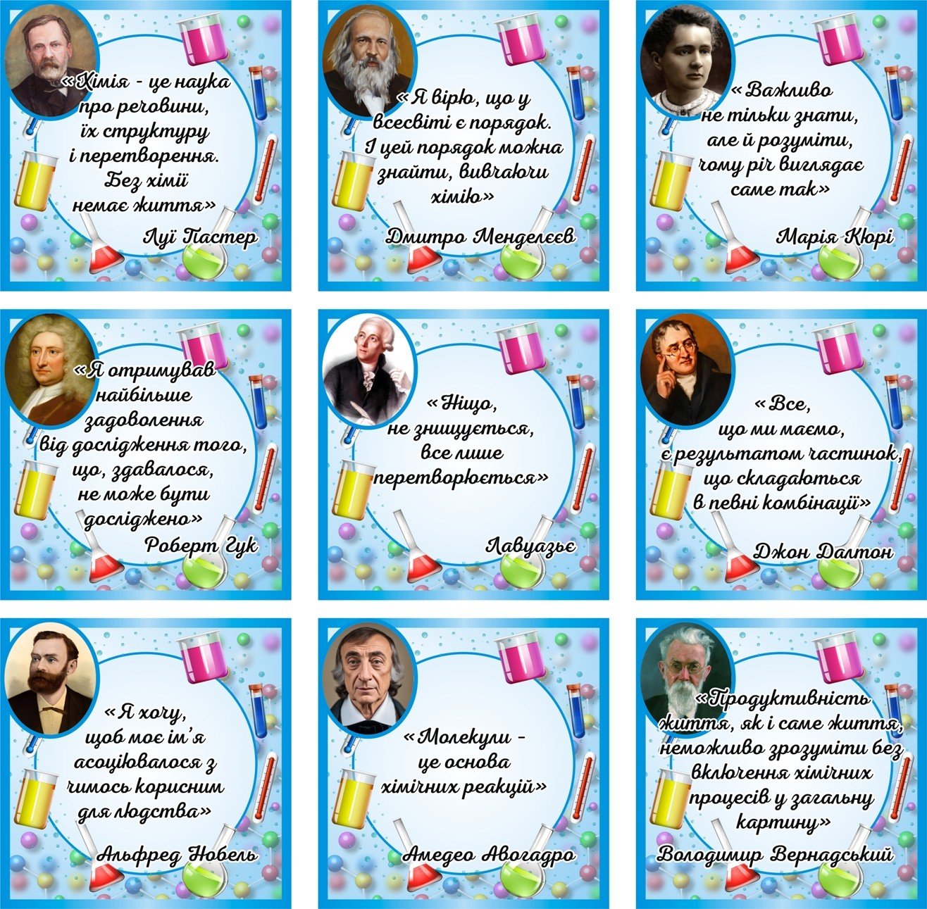 Стенд для кабінету хімії «Вислови відомих» в асортименті (Артикул: 3-2297) Характеристики Розмір: 350мм.×350мм. Матеріал: пластик товщиною 3 мм. Вартість: 178 грн. 162 грн. / один -10% Швидке замовлення Короткий опис стенда(ів) Стенд присвячений відомим вченим-хімікам та їхнім цитатам про науку хімію. Кожна частина стенда включає портрет видатного науковця і його вислів, який розкриває значення хімії та її вплив на життя та розвиток науки. Наприклад, Луї Пастер говорить про життєво важливу роль хімії, а Дмитро Менделєєв наголошує на порядок у Всесвіті, який можна пізнати через вивчення хімії. Лавуазьє: про збереження матерії. Марія Кюрі: важливість розуміння причин. Андреас Нобель: прагнення до користі для людства. Це підкреслює значущість хімії у різних аспектах життя та науки. Додаткова інформація Термін виготовлення: 3-5 робочих днів. Можливість ламінування: Немає. 🖨️ Друкувати Зачекайте, будь ласка ⚖️
