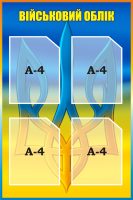 Інформаційний стенд «Військовий облік» на 5 кишень (Артикул: 3-0504) Характеристики Розмір: 800мм.х800мм. Матеріал: пластик товщиною 3 мм. Вартість: 1051 грн. Швидке замовлення Короткий опис стенда(ів) Стенд призначений для організації та відображення інформації на тему військового обліку. На стенді передбачено п'ять місць формату А4 для розміщення важливих документів або оголошень. У центрі стенду розміщено зображення тризуба — державного герба України, що символізує зв'язок з національною ідентичністю та військовою службою. Тло стенду виконано у кольорах національного прапора України — синьому та жовтому. Цей стенд може використовуватись у військових частинах, установах та інших організаціях, що займаються питаннями військового обліку. Додаткова інформація Термін виготовлення: 3-5 робочих днів. Можливість ламінування: Немає. 🖨️ Друкувати Зачекайте, будь ласка ⚖️