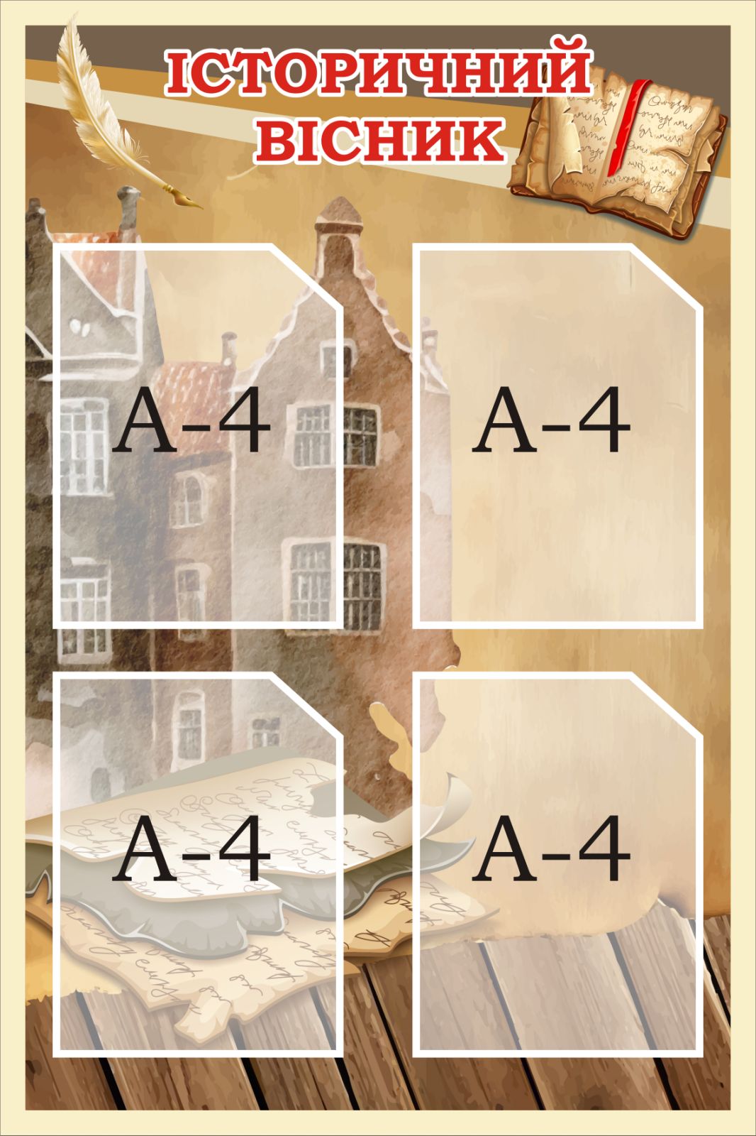 Стенд «Історичний вісник» для кабінету історії (Артикул: 3-2356) Характеристики Розмір: 600мм.×960мм. Матеріал: пластик товщиною 3 мм. Вартість: 1026 грн. 933 грн. -10% Швидке замовлення Короткий опис стенда(ів) Стенд під назвою "Історичний вісник" призначений для освітньої установи, де можна розмістити інформаційні матеріали формату A4. Він оформлений зображенням старовинних будинків, пір'я та книги, що створює атмосферу історичного минулого. Усі чотири розділи стенду призначені для розміщення матеріалів і можуть використовуватися для висвітлення важливих історичних подій, видатних діячів, фактів або анонсів. Завдяки такому підходу, стенд стає корисним інструментом візуалізації історичних знань для учнів або відвідувачів. Додаткова інформація Термін виготовлення: 3-5 робочих днів. Можливість ламінування: Немає. 🖨️ Друкувати Зачекайте, будь ласка ⚖️