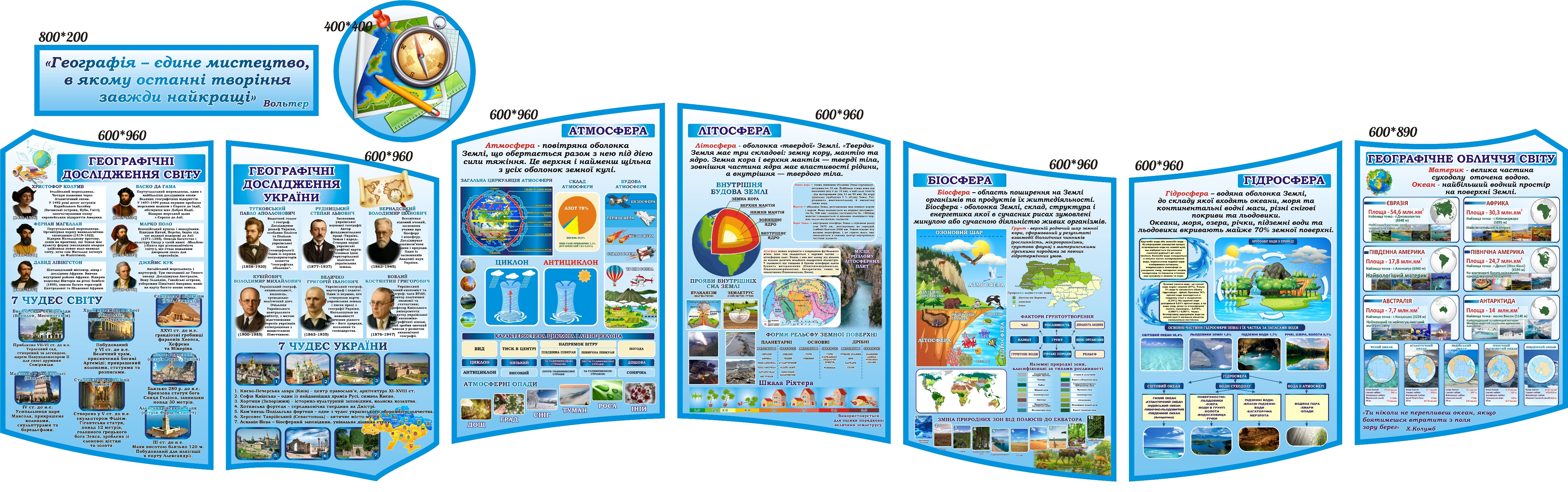 Комплект стендів «Географія — наука про Землю» (Артикул: 3-2359) Характеристики Розмір: 800мм.×200мм., 400мм.×400мм., 600мм.×960мм.×6шт., 600мм.×890мм. Матеріал: пластик товщиною 3 мм. Вартість: 7416 грн. 6180 грн. -20% Швидке замовленняКожен елемент комплекту можна придбати окремо. Короткий опис стенда(ів) Стенди присвячені географії та складаються з декількох секцій, які детально описують різні аспекти науки. Географічні дослідження світу і Географічні дослідження України: представлені видатні дослідники та їхні відкриття, а також списки 7 чудес світу та України. Атмосфера: пояснено поняття атмосфери, її склад і значення для життя на Землі. Літосфера: структура земної кори, формування рельєфу, внутрішня будова Землі. Біосфера: показано взаємодію живих організмів і середовища, види природних зон. Гідросфера: водні ресурси Землі, як вони розподілені між океанами, морями. Географічне обличчя світу: материки, найбільші об'єкти поверхні. Додаткова інформація Термін виготовлення: 3-5 робочих днів. Можливість ламінування: Немає. 🖨️ Друкувати Зачекайте, будь ласка ⚖️