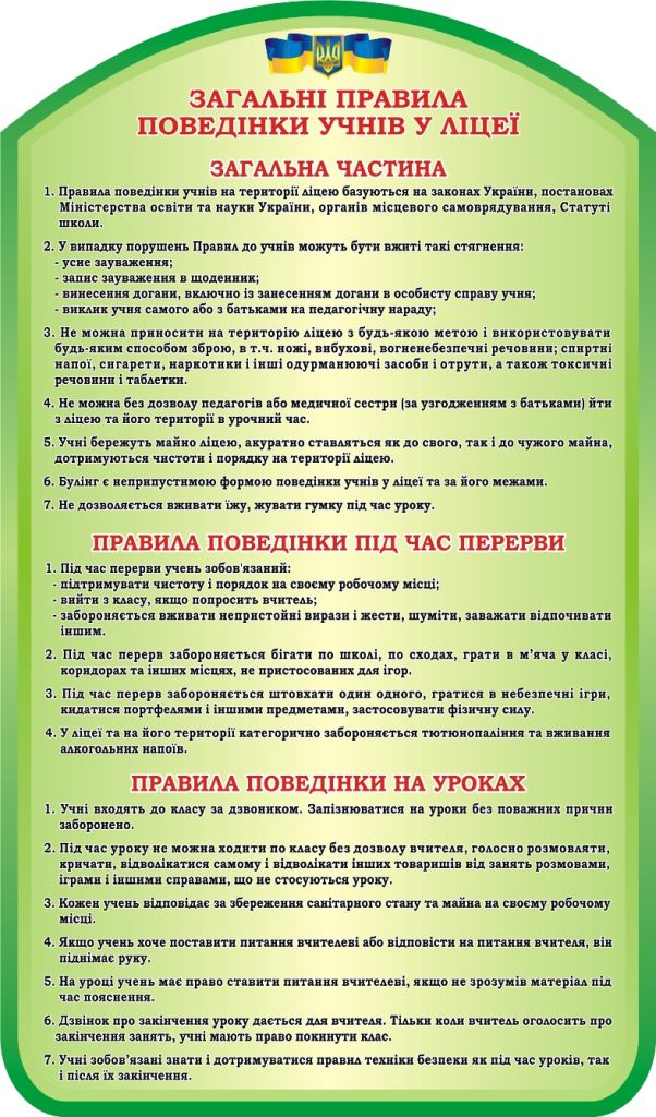 Пластиковий стенд «Загальні правила поведінки учнів у ліцеї» (Артикул: 3-0919) Характеристики Розмір: 500мм.×850мм. Матеріал: пластик товщиною 3 мм. Вартість: 617 грн. Швидке замовлення Короткий опис стенда(ів) Стенд «Загальні правила поведінки учнів у ліцеї» містить рекомендації та обмеження щодо поведінки учнів на території навчального закладу. Він поділений на три частини: «Загальна частина», «Правила поведінки під час перерви» та «Правила поведінки на уроках». Загальна частина: Дотримання законів України та статуту школи. Заборона проносити небезпечні предмети та алкоголь. Під час перерви: Учні повинні дотримуватись порядку та уникати небезпечних ігор. Заборонено бігати та шуміти. На уроках: Запізнення без поважних причин заборонено. Тримати порядок на робочому місці. Додаткова інформація Термін виготовлення: 3-5 робочих днів. Можливість ламінування: Немає. 🖨️ Друкувати Зачекайте, будь ласка ⚖️
