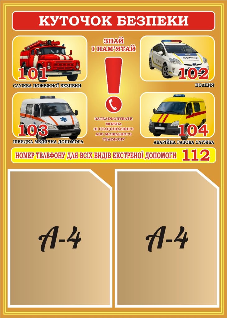 Пластиковий стенд «Твій путівник безпеки» (Артикул: 3-0927) Характеристики Розмір: 500мм.×700мм. Матеріал: пластик товщиною 3 мм. Вартість: 557 грн. Швидке замовлення Короткий опис стенда(ів) Стенд "Куточок безпеки" інформує про номери телефонів екстрених служб. Він допомагає швидко зв'язатися з потрібною службою в разі небезпеки: 101 - Служба пожежної безпеки 102 - Поліція 103 - Швидка медична допомога 104 - Аварійна газова служба Також є універсальний номер 112 для всіх видів екстреної допомоги. Зазначено, що зателефонувати можна зі стаціонарного або мобільного телефону. Додаткова інформація Термін виготовлення: 3-5 робочих днів. Можливість ламінування: Немає. 🖨️ Друкувати Зачекайте, будь ласка ⚖️