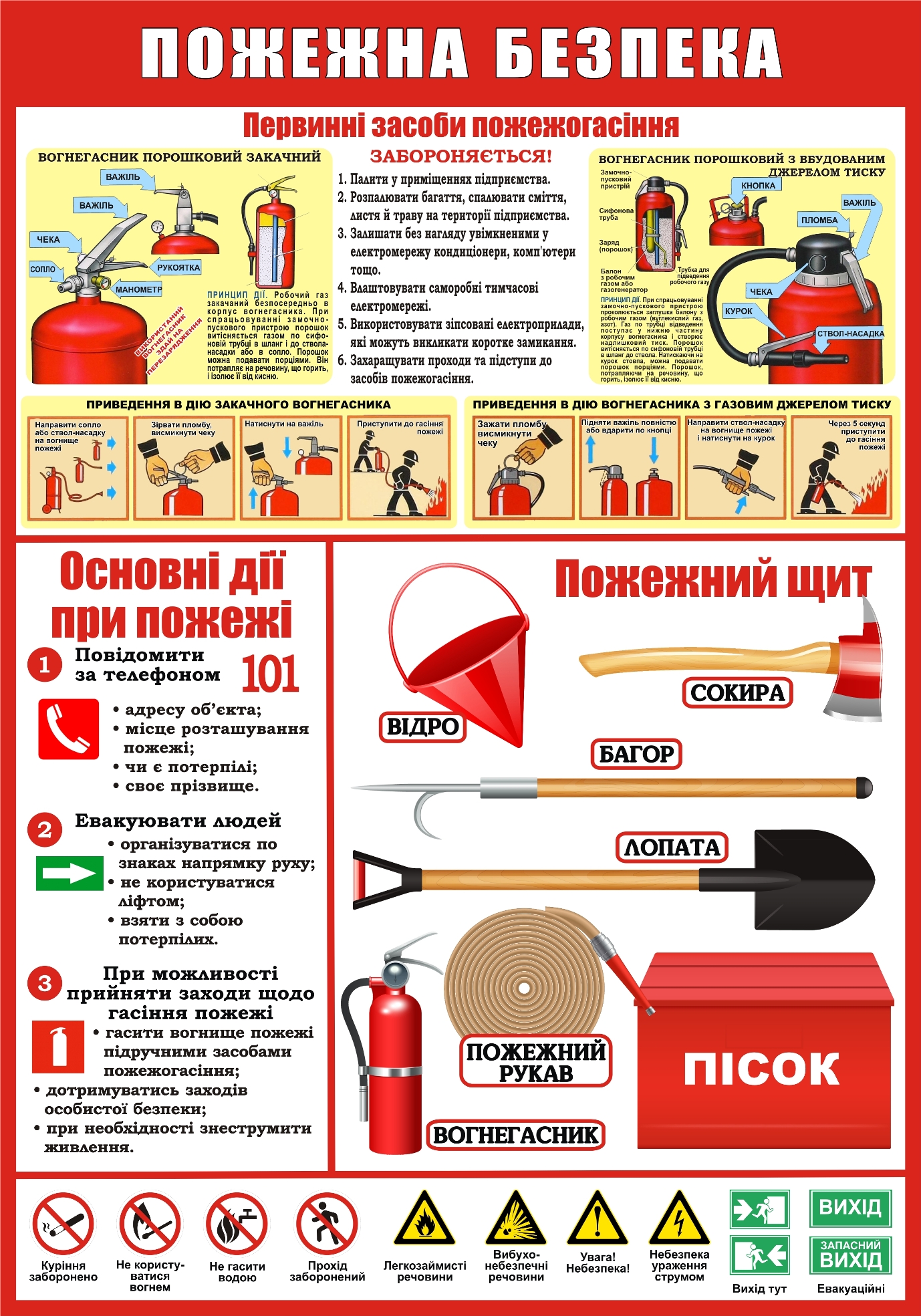 Пластиковий стенд «Пожежна безпека» (Артикул: 3-0957) Характеристики Розмір: 700мм.×1000мм. Матеріал: пластик товщиною 3 мм. Вартість: 1016 грн. Швидке замовлення Короткий опис стенда(ів) Стенд "Пожежна безпека" призначений для інформування про первинні засоби пожежогасіння та дії під час пожежі. Він містить детальні інструкції щодо користування порошковими вогнегасниками, включаючи порядок приведення їх у дію. Основні дії при пожежі: Повідомити за телефоном 101 з вказанням адреси, місця розташування, інформації про постраждалих і свого прізвища. Евакуювати людей, орієнтуючись на знаки напряму руху. При можливості, спробувати загасити пожежу за допомогою доступних засобів, дотримуючись особистої безпеки. Також стенд містить інформацію про пожежний щит, який включає відро, сокиру, багор, лопату, пожежний рукав і ящик з піском. Додаткова інформація Термін виготовлення: 3-5 робочих днів. Можливість ламінування: Немає. 🖨️ Друкувати Зачекайте, будь ласка ⚖️