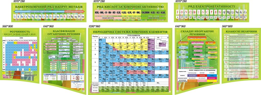 Комплект пластикових стендів «Хімія: довідкові таблиці та схеми» (Артикул: 3-1026) Характеристики Розмір: 1070мм.×280мм.×3шт., 560мм.×800мм.×2шт., 640мм.×960мм.×3шт., 1200мм.×960мм. Матеріал: пластик товщиною 3 мм. Вартість: 6669 грн. 6063 грн. -10% Швидке замовленняКожен елемент комплекту можна придбати окремо. Короткий опис стенда(ів) Комплект стендів присвячений хімії та включає інформацію про різні аспекти цієї науки. Електрохімічний ряд напруг металів і ряд кислот за хімічною активністю описують активність елементів та кислот, що сприяє розумінню їх взаємодій. Ряд електронегативності допомагає визначити, як елементи притягують електрони. Розчинність кислот, основ і солей у воді представлена у вигляді таблиці, що показує розчинність різних речовин. Стенди по класифікації органічних речовин і складним неорганічним речовинам наводять структуровану інформацію про різновиди сполук. Періодична система хімічних елементів надає базові знання про всі елементи. Кількісні величини розкривають математичні аспекти хімії. Додаткова інформація Термін виготовлення: 3-5 робочих днів. Можливість ламінування: Немає. 🖨️ Друкувати Зачекайте, будь ласка ⚖️