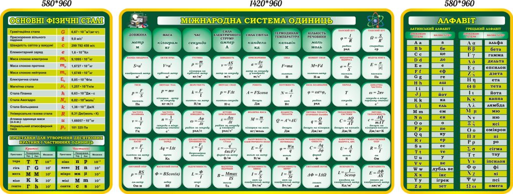 Комплект пластикових стендів «Фізичні величини та одиниці» (Артикул: 3-1038) Характеристики Розмір: 1420мм.×960мм., 580мм.×960мм.×2шт. Матеріал: пластик товщиною 3 мм. Вартість: 3596 грн. Швидке замовленняКожен елемент комплекту можна придбати окремо. Короткий опис стенда(ів) Стенди містять інформацію для вивчення фізики, включаючи важливі фізичні сталі, Міжнародну систему одиниць та алфавіт. Основні фізичні сталі представлені у вигляді таблиці з константами, такими як гравітаційна стала (G), швидкість світла у вакуумі (c), електрична стала (ε₀) та інші. Міжнародна система одиниць описує базові одиниці, такі як метри, кілограми, секунди, ампери тощо, а також похідні величини та формули для різних фізичних параметрів. Алфавіт містить латинські та грецькі літери з їхніми назвами, що корисно для розуміння наукової термінології. Додаткова інформація Термін виготовлення: 3-5 робочих днів. Можливість ламінування: Немає. 🖨️ Друкувати Зачекайте, будь ласка ⚖️