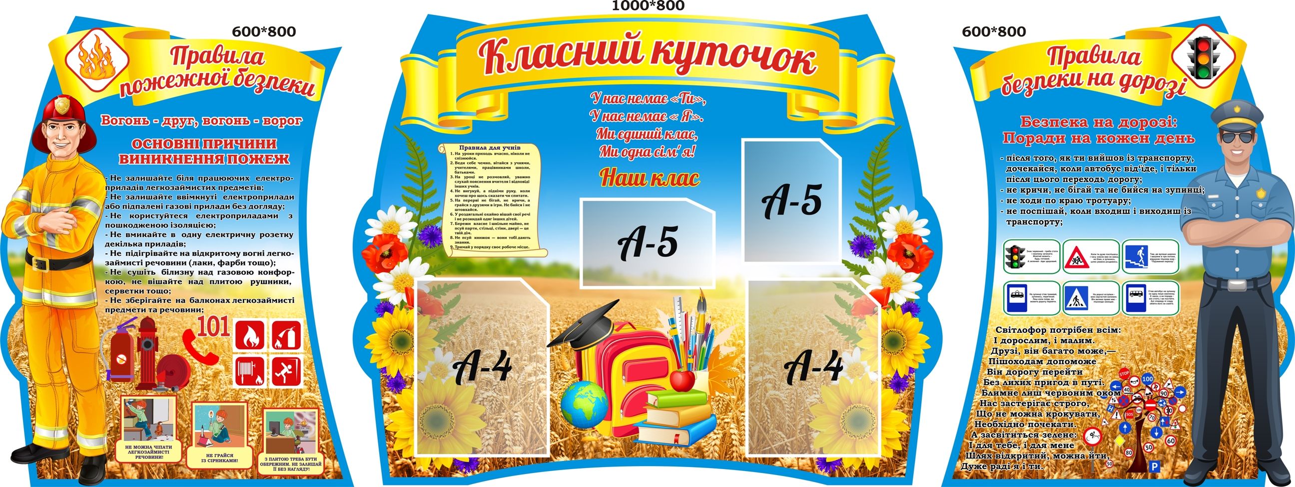 Комплект пластикових стендів «Класний куточок та безпека» (Код: 3-1039) Характеристики Розмір: 600мм.×800мм.×2шт., 1000мм.×800мм. Матеріал: пластик товщиною 3 мм. Вартість: 2626 грн. Швидке замовленняКожен елемент комплекту можна придбати окремо. Короткий опис стенда(ів) Стенди на зображенні присвячені правилам безпеки та освітнім інформаційним матеріалам. Правила пожежної безпеки: Не залишайте ввімкнені електроприлади без нагляду. Не використовуйте електроприлади з пошкодженою ізоляцією. 101 – номер екстреної служби. Класний куточок: Містить місце для інформації про клас. Секція з правилами для учнів. Правила безпеки на дорозі: Не бігайте по дорозі. Не ходіть по краю тротуару. Світлофор та дорожні знаки – основи безпеки. Додаткова інформація Термін виготовлення: 3-5 робочих днів. Можливість ламінування: Немає. 🖨️ Друкувати Зачекайте, будь ласка ⚖️