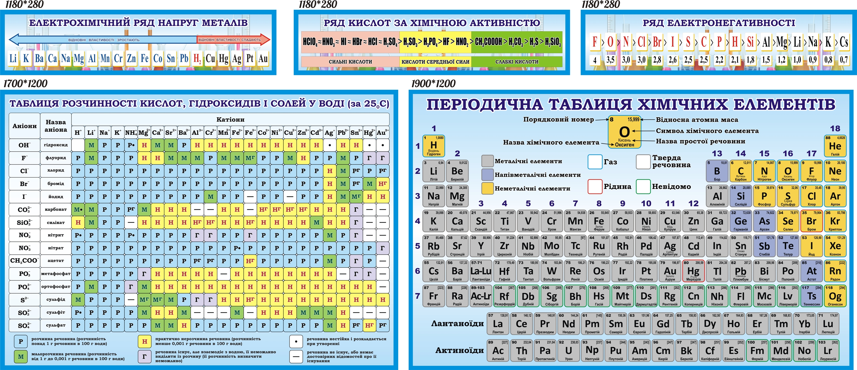 Навчальний комплект пластикових стендів з хімії (Артикул: 3-1040) Характеристики Розмір: 1180мм.×280мм.×3шт., 1700мм.×1200мм., 1900мм.×1200мм. Матеріал: пластик товщиною 3 мм. Вартість: 7712 грн. Швидке замовленняКожен елемент комплекту можна придбати окремо. Короткий опис стенда(ів) Стенди з хімії охоплюють різні аспекти навчального матеріалу: Електрохімічний ряд напруг металів демонструє схильність металів до окислення. Ряд кислот за хімічною активністю допомагає класифікувати кислоти за їхньою силою. Ряд електронегативності дає уявлення про здатність атомів приймати електрони. Таблиця розчинності наочний посібник для визначення розчинності різних сполук у воді при 25°C. Періодична таблиця хімічних елементів містить основну інформацію про елементи, їх групи та властивості. Додаткова інформація Термін виготовлення: 3-5 робочих днів. Можливість ламінування: Немає. 🖨️ Друкувати Зачекайте, будь ласка ⚖️