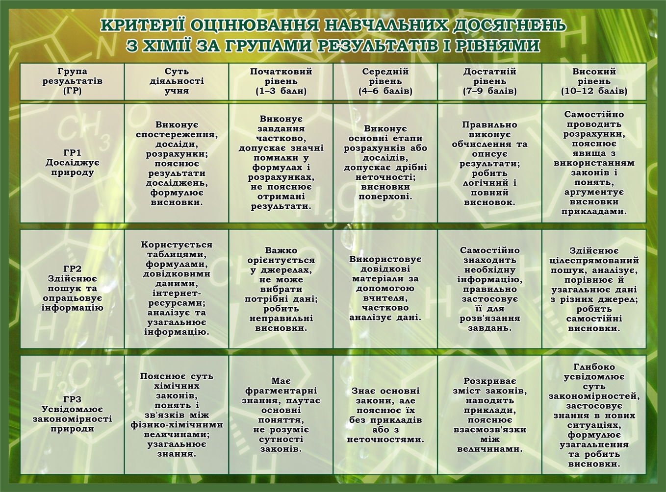Пластиковий стенд «Критерії оцінювання з хімії за рівнями» (Артикул: 3-1048) Характеристики Розмір: 1150мм.×850мм. Матеріал: пластик товщиною 3 мм. Вартість: 1560 грн. 1419 грн. -10% Швидке замовлення Короткий опис стенда(ів) Стенд присвячений критеріям оцінювання навчальних досягнень з хімії. Він розподіляє результати на групи та рівні: початковий, середній, достатній і високий. Кожна група результатів (ГР1, ГР2, ГР3) висвітлює різні аспекти діяльності учня: ГР1 Досліджує природу: виконання спостережень і дослідів. ГР2 Здійснює пошук: користування інформаційними джерелами. ГР3 Усвідомлює закономірності: розуміння хімічних законів. Стенд надає чіткі критерії для визначення рівня знань учня від початкового до високого залежно від його вмінь та навичок. Додаткова інформація Термін виготовлення: 3-5 робочих днів. Можливість ламінування: Немає. 🖨️ Друкувати Зачекайте, будь ласка ⚖️