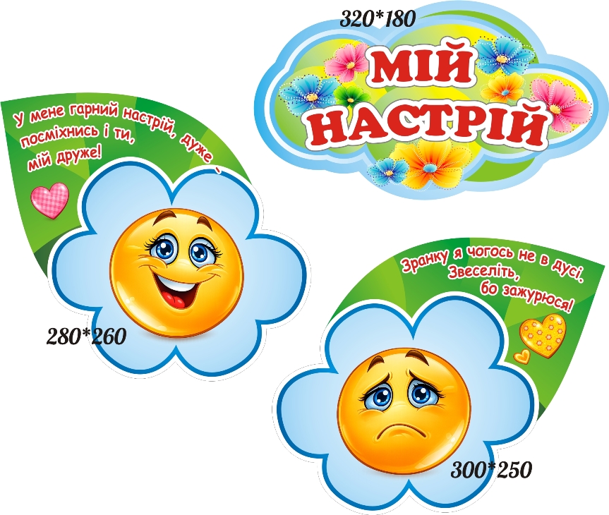 Набір стендів для НУШ «Мій настрій» (Артикул: 3-1070) Характеристики Розмір: 320мм.х180мм., 280мм.х260мм., 300мм.х250мм. Матеріал: пластик товщиною 3 мм. Вартість: 298 грн. Швидке замовленняКожен елемент комплекту можна придбати окремо. Короткий опис стенда(ів) Стенд "Мій настрій" призначений для вираження емоцій та настрою дітей у навчальних або виховних закладах. Цей набір містить три елементи: Основний стенд розміром 320x180 мм, прикрашений квітами та написом "Мій настрій". Смайлик з веселим обличчям на фоні квітки: "У мене гарний настрій, посміхнись і ти, мій друже!" Розмір – 280x260 мм. Смайлик із сумним обличчям: "Зранку я чогось не в дусі. Звеселіть, бо зажурюся!" Розмір – 300x250 мм. Цей комплект допомагає дітям навчитися розпізнавати та виражати власні емоції, сприяючи емоційному розвитку та спілкуванню в групі. Додаткова інформація Термін виготовлення: 3-5 робочих днів. Можливість ламінування: Немає. 🖨️ Друкувати Зачекайте, будь ласка ⚖️