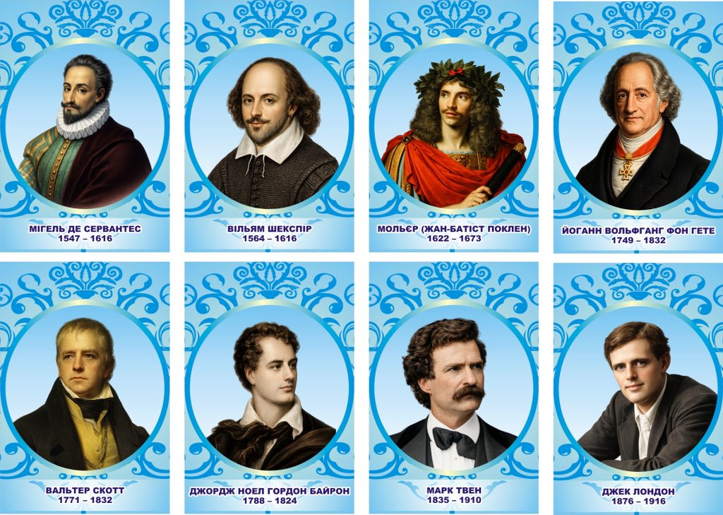 Пластикові стенди «Класики світової літератури» (АРТИКУЛ: 3-1077) Характеристики Розмір: 370мм.×550мм. Матеріал: пластик товщиною 3 мм. Вартість: 354 грн. 295 грн. / один -20% Швидке замовлення Короткий опис стенда(ів) Стенд представляє відомих письменників з різних епох та країн, які зробили суттєвий внесок у світову літературу. На стенді зображені: Мігель де Сервантес (1547–1616) — іспанський письменник, автор «Дон Кіхота». Вільям Шекспір (1564–1616) — англійський драматург і поет. Мольєр (Жан-Батіст Поклен) (1622–1673) — французький драматург. Йоганн Вольфґанґ фон Ґете (1749–1832) — німецький поет і прозаїк. Вальтер Скотт (1771–1832) — шотландський письменник. Джордж Ноел Гордон Байрон (1788–1824) — англійський поет. Марк Твен (1835–1910) — американський письменник і гуморист. Джек Лондон (1876–1916) — американський автор пригодницьких творів. Стенд демонструє величезний культурний вплив цих літературних діячів. Додаткова інформація Термін виготовлення: 3-5 робочих днів. Можливість ламінування: Немає. 🖨️ Друкувати Зачекайте, будь ласка ⚖️