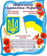 Одним із завдань національно- патріотичного виховання є формування поваги до державної символіки: Герба, прапору, Гімну України. У кожному класному кабінеті повинні бути стенди з державними символами. По класах проводиться роз’яснювальна робота серед учнів , виховні заходи, бесіди, присвячені висвітленню історії формування державних символів України, їх значення і використання в різні історичні періоди, шанобливому ставленню до них. І, звісно ж, як тут не звернутися до яскравого, обрамленого народними символами, стенду!?