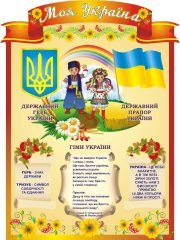 Одним із завдань національно- патріотичного виховання є формування поваги до державної символіки: Герба, прапору, Гімну України. У кожному класному кабінеті повинні бути стенди з державними символами. По класах проводиться роз’яснювальна робота серед учнів , виховні заходи, бесіди, присвячені висвітленню історії формування державних символів України, їх значення і використання в різні історичні періоди, шанобливому ставленню до них. І, звісно ж, як тут не звернутися до яскравого, обрамленого народними символами, стенду!?