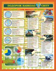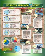Стенд «Подорож навколо світу» призначений для кабінету географії. На даному стенді відображений перелік материків (Євразія, Африка, Північна Америка, Південна Америка, Австралія, Антарктида), океанів (Тихий океан, Атлантичний океан, Індійський океан, Північний Льодовитий океан). Діаграма співвідношення і розподіл суходолу й світового океану на землі. Завдяки такмим стендам діти можуть "здійснити подорож навколо світу" і побачити цілий світ, не виходячи з класу.