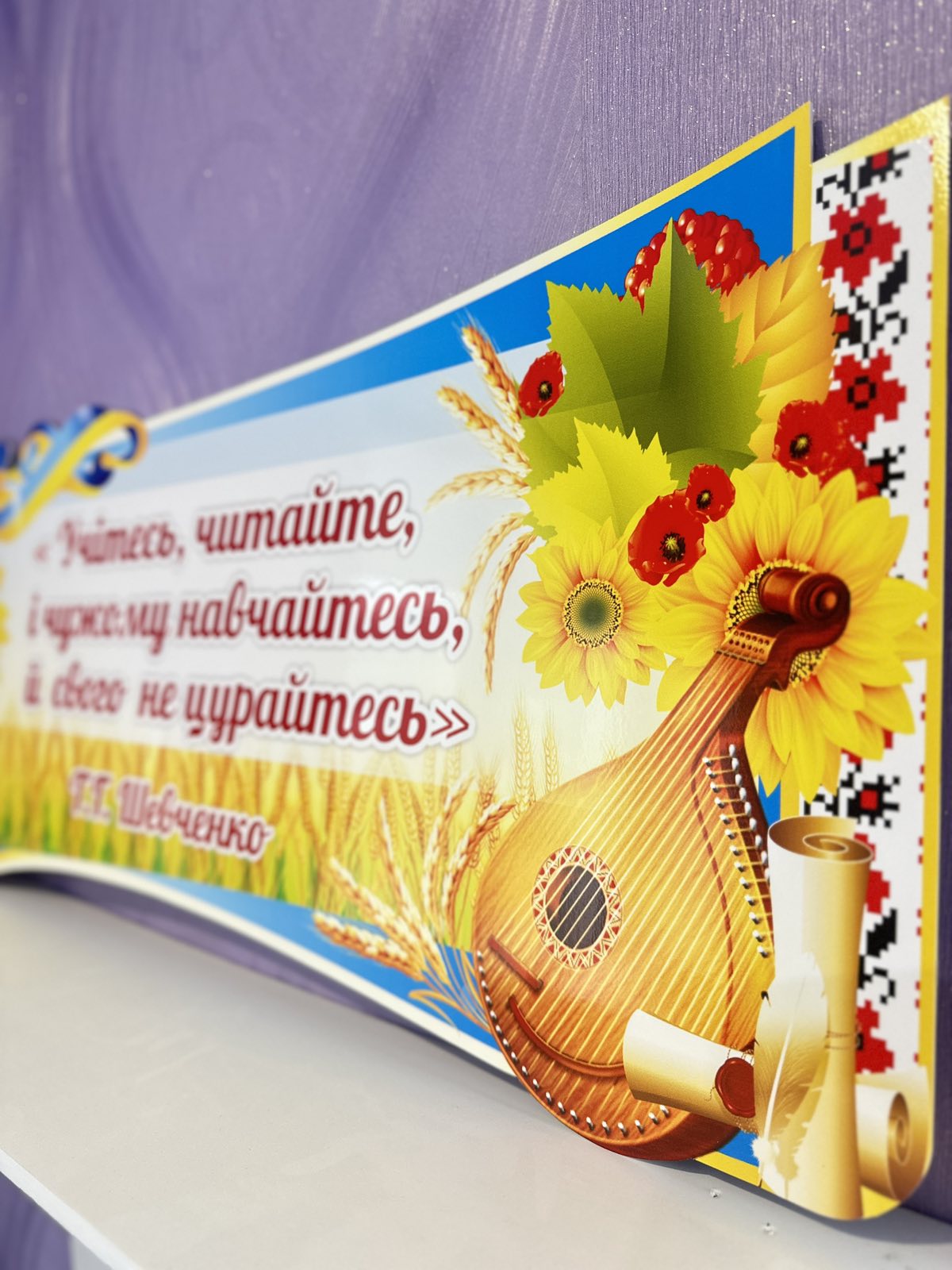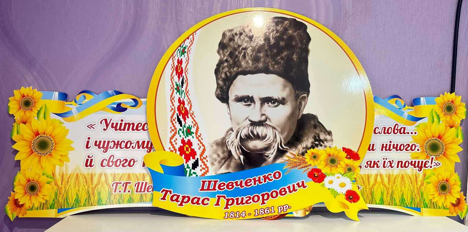 Набір стендів над дошкою (Артикул: 3-0723) Характеристики Розмір: 800мм.×370мм.×2шт., 600мм.×570мм. Матеріал: пластик товщиною 3 мм. Вартість: 1626 грн. 1355 грн. -20% Швидке замовленняКожен елемент комплекту можна придбати окремо. Короткий опис стенда(ів) Стенд присвячений Тарасу Григоровичу Шевченку, видатному українському поету та художнику. На стенді зображено портрет Шевченка та дві цитати з його поезій, що підкреслюють важливість слова, навчання та збереження своїх традицій. Цитата 1: «Ну що б, здавалося, слова... Слова та голос — більш нічого. А серце б'ється — ожива, як їх почує!» Цитата 2: «Учітеся, читайте, і чужому научайтесь, й свого не цурайтесь». Декорований соняшниками та національними українськими елементами, стенд покликаний надихати та спонукати до пізнання культури та літератури України. Додаткова інформація Термін виготовлення: 3-5 робочих днів. Можливість ламінування: Немає. 🖨️ Друкувати Зачекайте, будь ласка ⚖️
