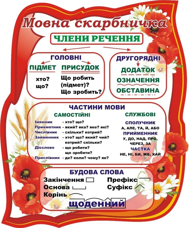 Стенд містить ключові елементи граматики, що допомагають учням швидко орієнтуватися в основних темах української мови.