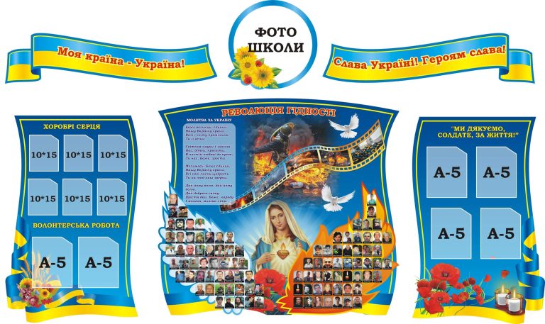 Окремі патріотичні стенди, такі як "Революція гідності", допоможуть створити у класах атмосферу поваги та гордості за країну. Вони можуть містити фотографії відомих постатей або історичні документи.