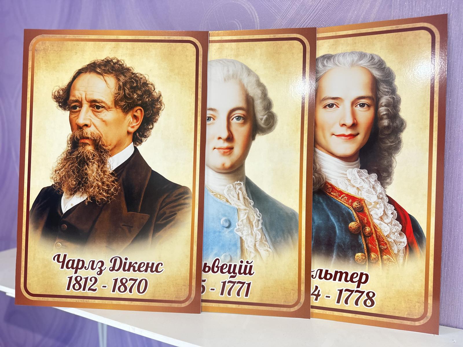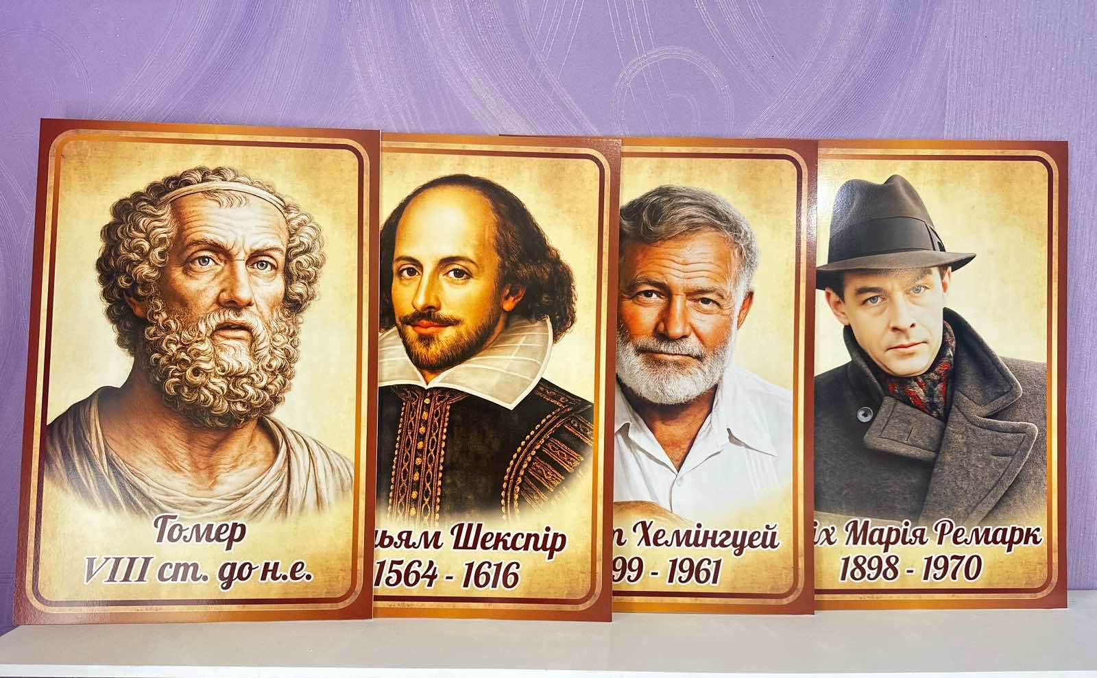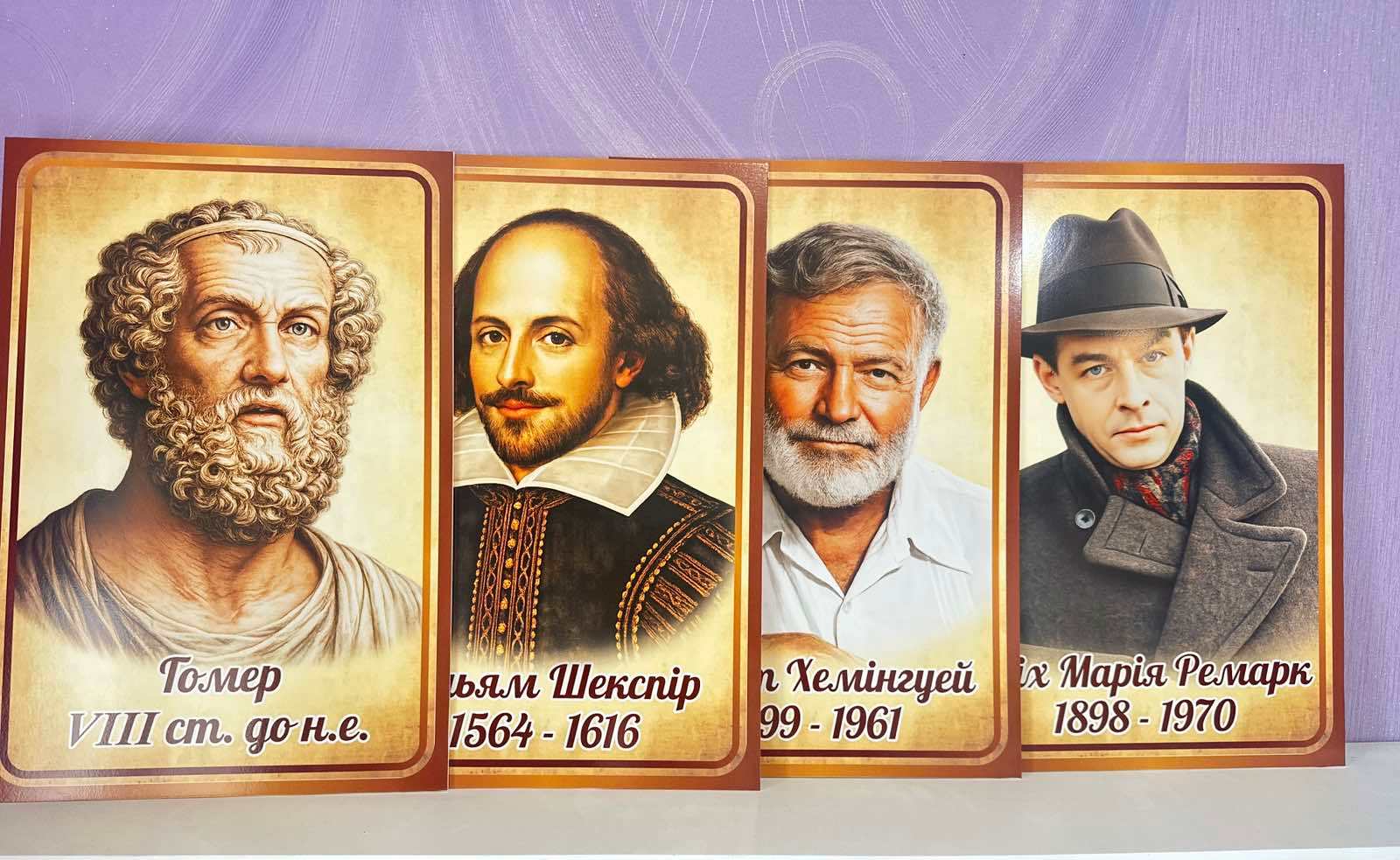 Пластикові стенди «Видатні письменники світу» (Артикул: 3-1110) Характеристики Розмір: 270мм.×400мм. Матеріал: пластик товщиною 3 мм. Вартість: 157 грн. / один Швидке замовлення Короткий опис стенда(ів) Стенд представляє видатних письменників та мислителів різних епох, які зробили значний внесок у світову літературу та філософію. Відомі постаті: Вільям Шекспір (1564 - 1616) - англійський драматург та поет. Ернест Хемінгуей (1899 - 1961) - американський письменник, відомий своїми романами. Чарльз Дікенс (1812 - 1870) - один з найвидатніших англійських романістів. Вольтер (1694 - 1778) - французький філософ та письменник. Гельвецій (1715 - 1771) - французький філософ-просвітник. Гомер - легендарний давньогрецький поет. Еріх Марія Ремарк (1898 - 1970) - німецький письменник. Віктор Гюго (1802 - 1885) - французький письменник-романтик. Жуль Верн (1828 - 1905) - французький письменник-фантаст. Шарлотта Бронте (1816 - 1855) - англійська письменниця. Додаткова інформація Термін виготовлення: 3-5 робочих днів. Можливість ламінування: Немає. 🖨️ Друкувати Зачекайте, будь ласка ⚖️