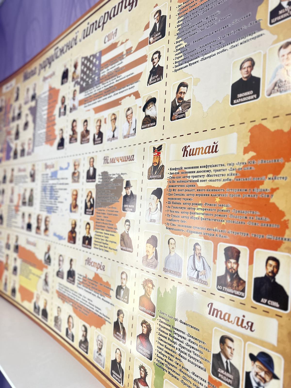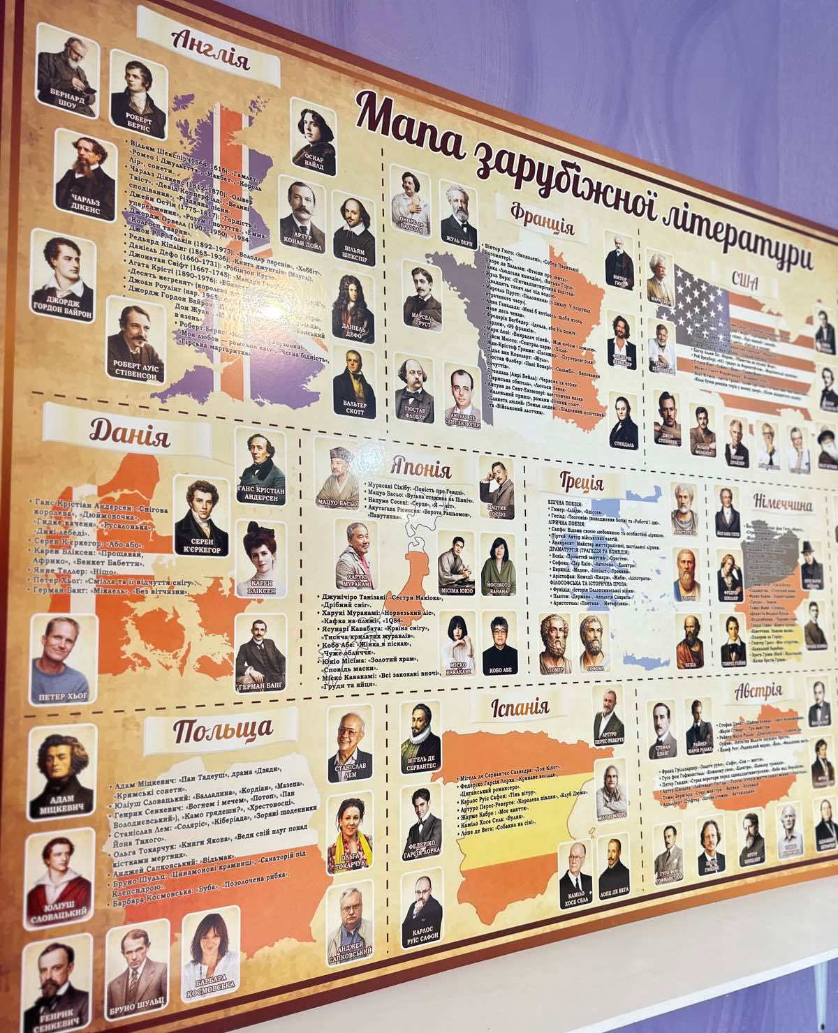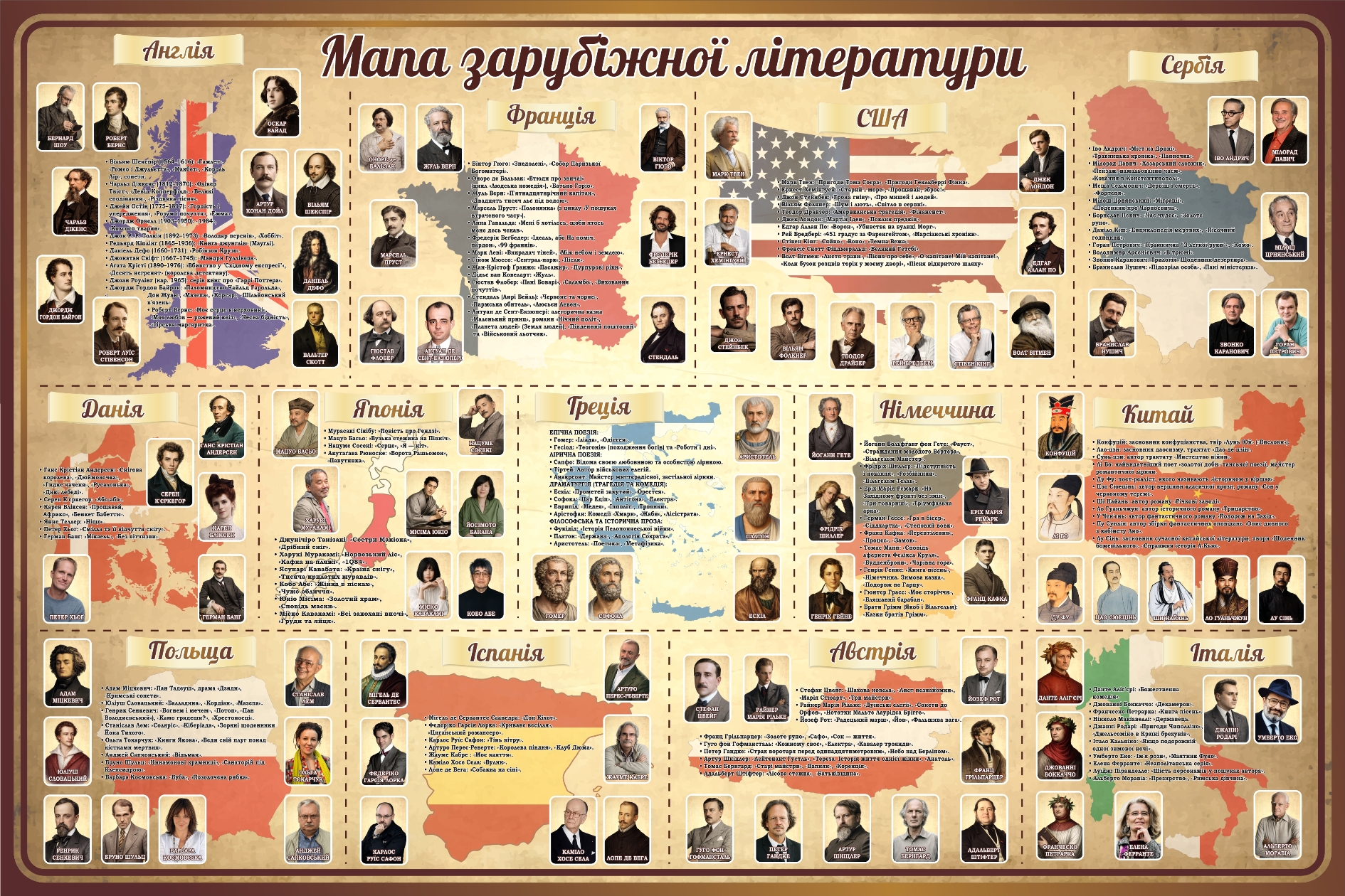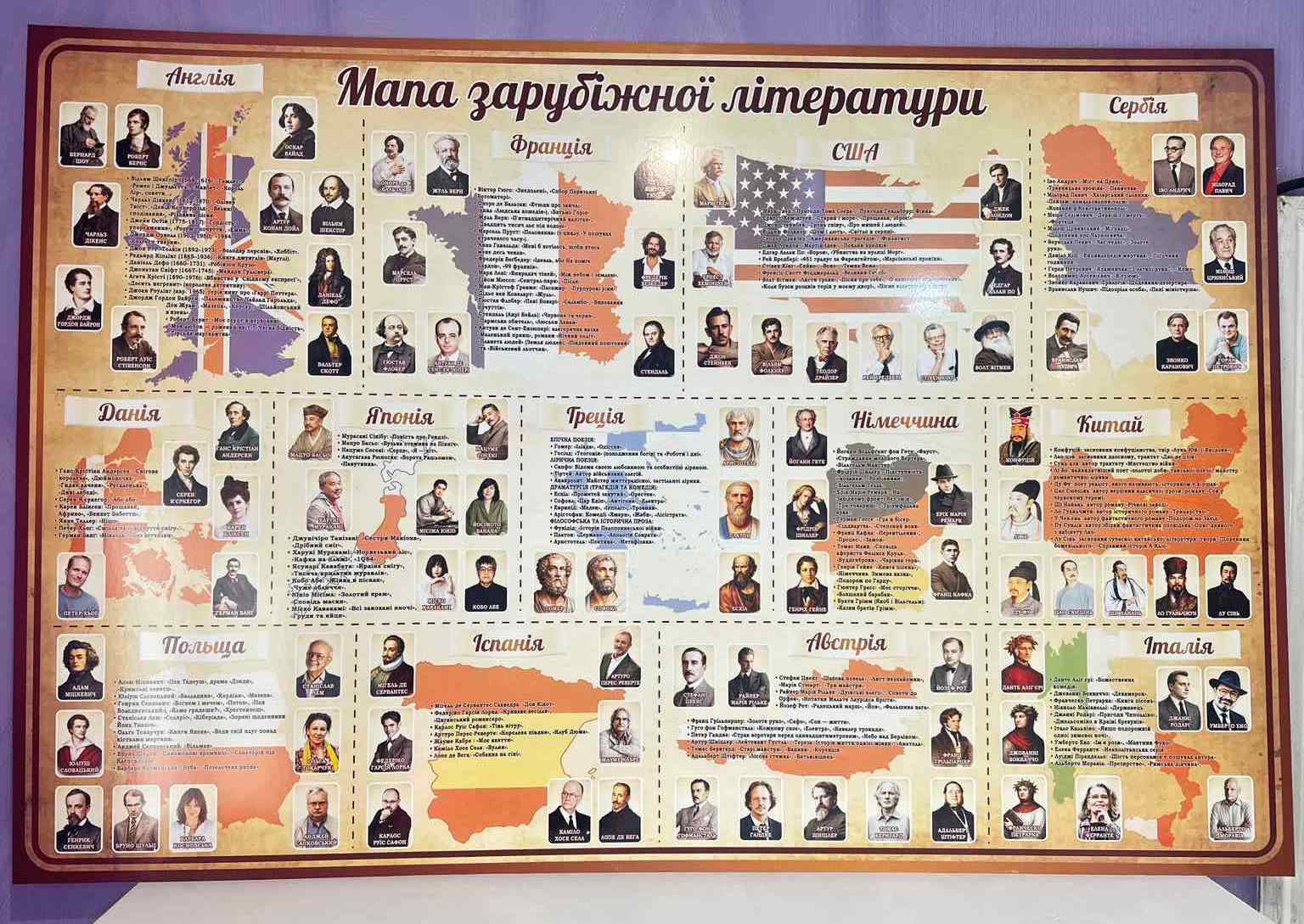 Пластиковий стенд «Мапа зарубіжної літератури» (Артикул: 3-1112) Характеристики Розмір: 1200мм.×800мм. Матеріал: пластик товщиною 3 мм. Вартість: 1394 грн. Швидке замовлення Короткий опис стенда(ів) Стенд "Карта зарубіжної літератури" ілюструє впливових письменників з різних країн світу. На ньому представлено портрети і короткі описи відомих авторів з Англії, Франції, США, Сербії, Данії, Японії, Греції, Німеччини, Китаю, Польщі, Іспанії, Австрії та Італії. Кожна область містить карту країни, де розташовані портрети письменників. Англія: містить відомих авторів, таких як Шекспір та Діккенс. Франція: представлена Гюґо і Бальзаком. США: містить класиків, наприклад, Фіцджеральда і Гемінґвея. Стенд сприяє ознайомленню з класикою світової літератури в шкільній програмі. Додаткова інформація Термін виготовлення: 3-5 робочих днів. Можливість ламінування: Немає. 🖨️ Друкувати Зачекайте, будь ласка ⚖️