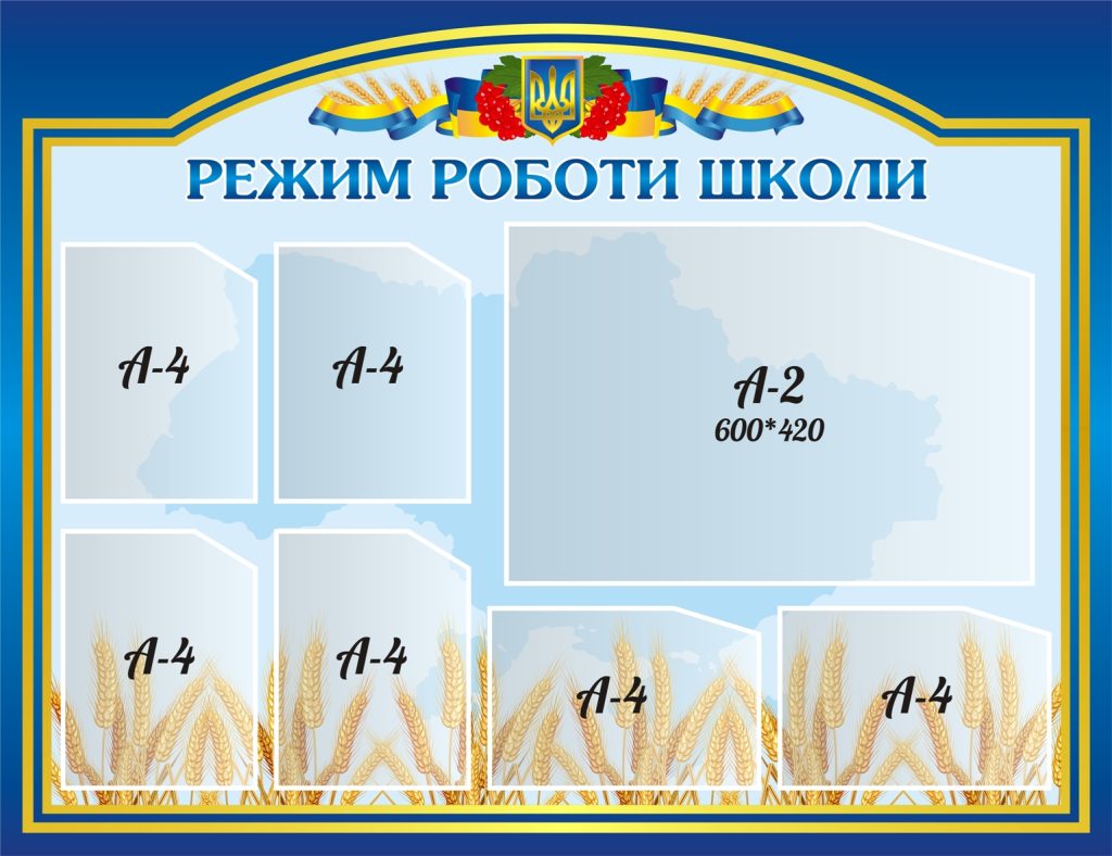 Стенд «Розклад та режим роботи школи» (Артикул: 3-1083) Характеристики Розмір: 1300мм.х1000мм. Матеріал: пластик товщиною 3 мм. Вартість: 2296 грн. 2088 грн. -10% Швидке замовлення Короткий опис стенда(ів) Стенд призначений для відображення інформації про режим роботи школи. На ньому є місце для різних форматів документів: п'ять відділів формату A-4 і один більший відділ формату A-2 (600x420 мм). Дизайн стенда містить зображення державного символу і національні елементи, такі як пшениця і стрічка з жовто-синіми кольорами, що підкреслює українську тематику та додає естетичної привабливості. Додаткова інформація Термін виготовлення: 3-5 робочих днів. Можливість ламінування: Немає. 🖨️ Друкувати Зачекайте, будь ласка ⚖️